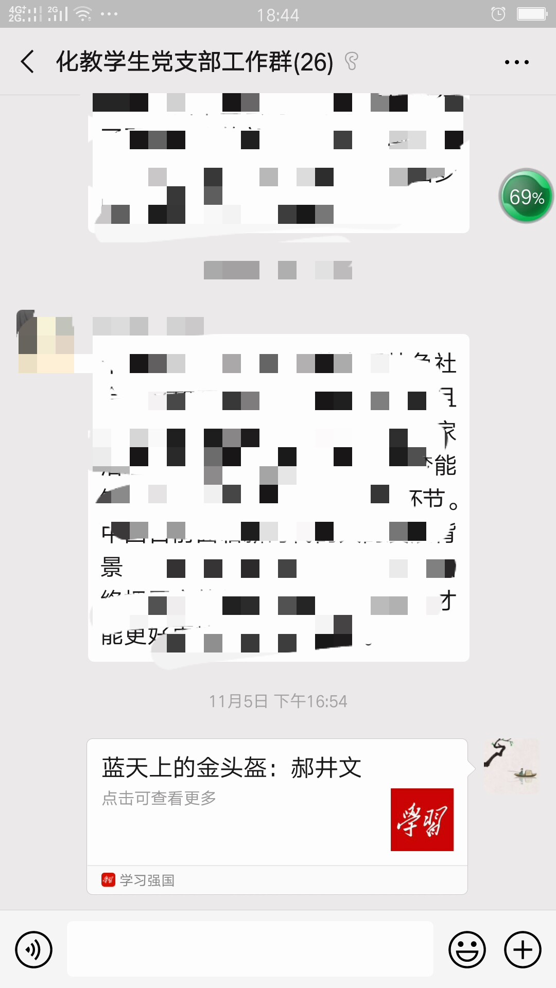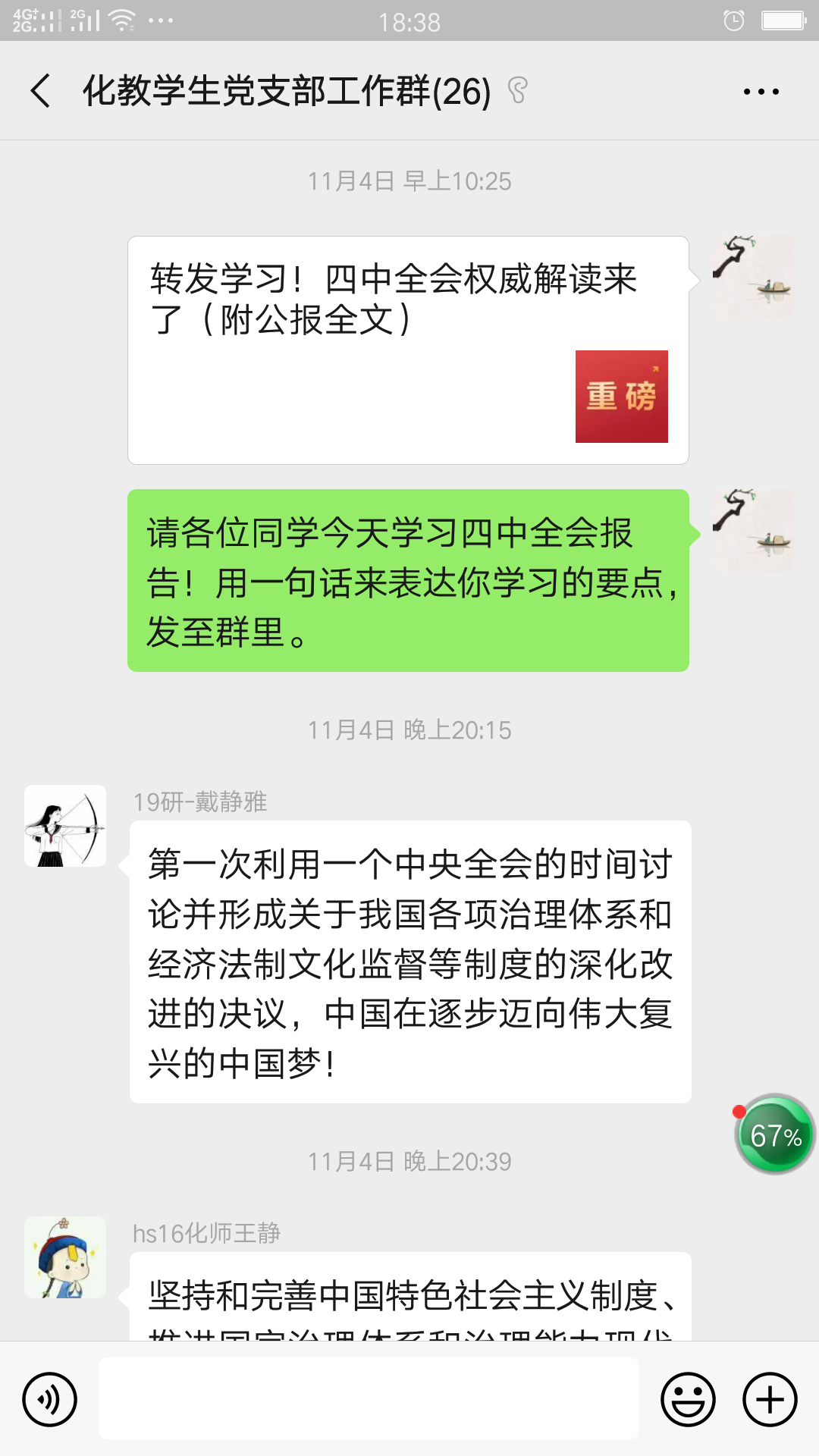 11月4日-5日,为丰富党支部主题教育开展形式,化学教育系学生党支部利用微信平台、学习强国学习平台等新媒体平台开展主题教育学习。(化学教育系学生党支部:王硕)