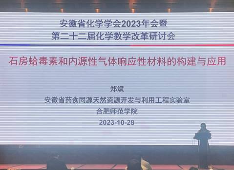 10月28日上午,大会开幕式及大会报告在巢湖国际饭店举行,来自中国科学技术的大学俞书宏院士、上海交通大学崔勇教授、南京理工大学程广斌教授以及安徽师范大学高峰教授先后做大会报告。28日下午,在酒店一楼玉满堂厅,来自合肥工业大学、安徽大学、安徽师范大学、安徽工程大学、安徽建筑大学、合肥学院和宿州学院的八位专家做了主题报告。他们从不同层面围绕着化学与化工类人才培养体系的建设、课程思政育人实践、化学国家级实验中心的建设以及学科发展等方面提出了各自的观点和思路。本次会议还设置青年论坛专场,旨在为广大青年教师提供一个相互学习和交流的平台,来自省内高校的12位青年教师做了学术报告。我校郑斌教授以“石房蛤毒素和内源性气体响应性材料的构建与应用”为题进行大会报告。