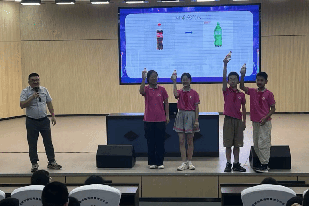 在南京路校区的六年级课堂上,王方阔教授化身“科学魔法师”,以“物质的变化”为主题,通过紫甘蓝酸碱变色、洗洁精乳化除油、溶液混合显色等科学小实验,将抽象的物理变化与化学变化概念转化为可观察、可参与的科学体验。引导学生从食物变质、铁生锈等现象中发现科学规律,培养“用科学眼光观察生活” 的科学思维习惯。