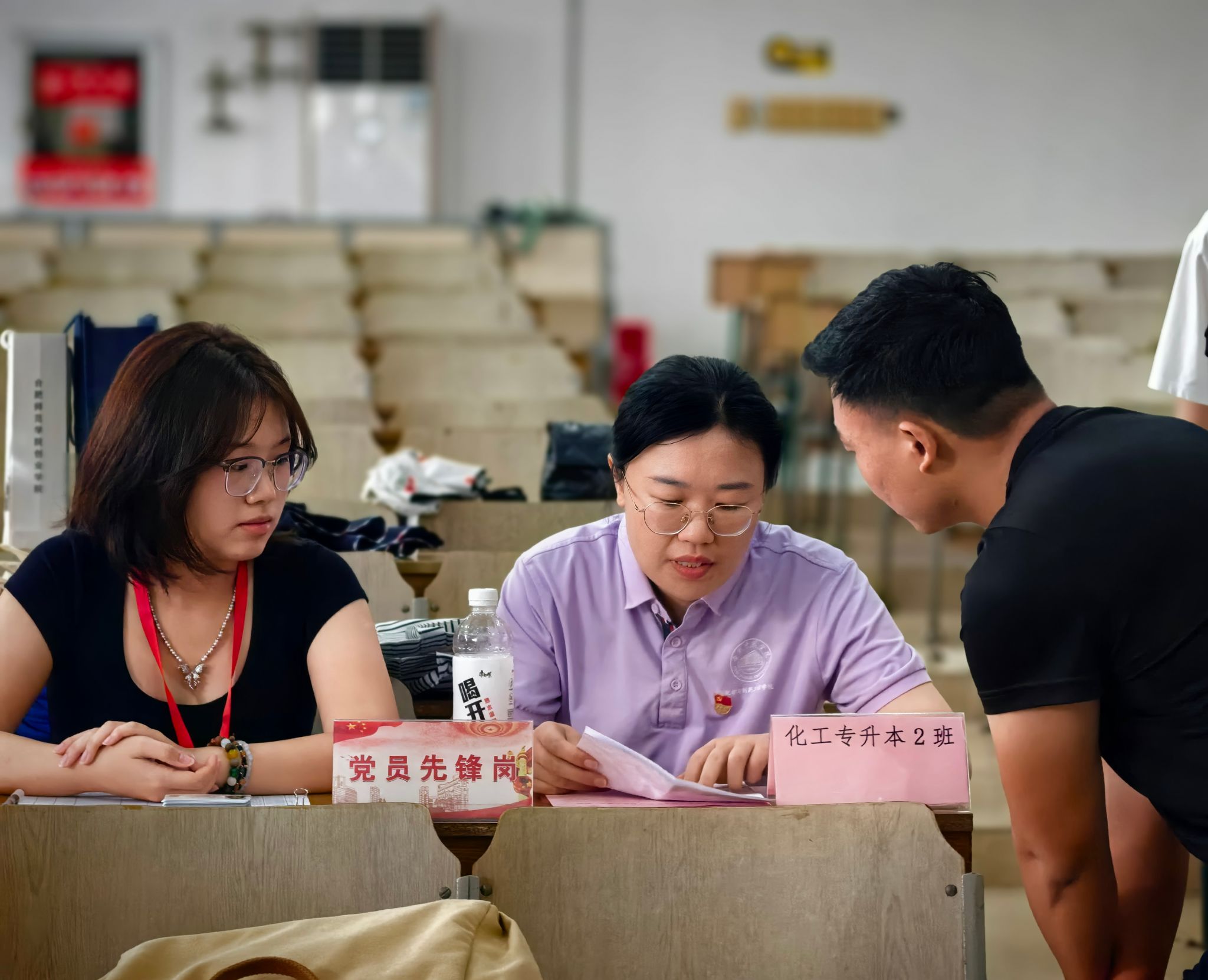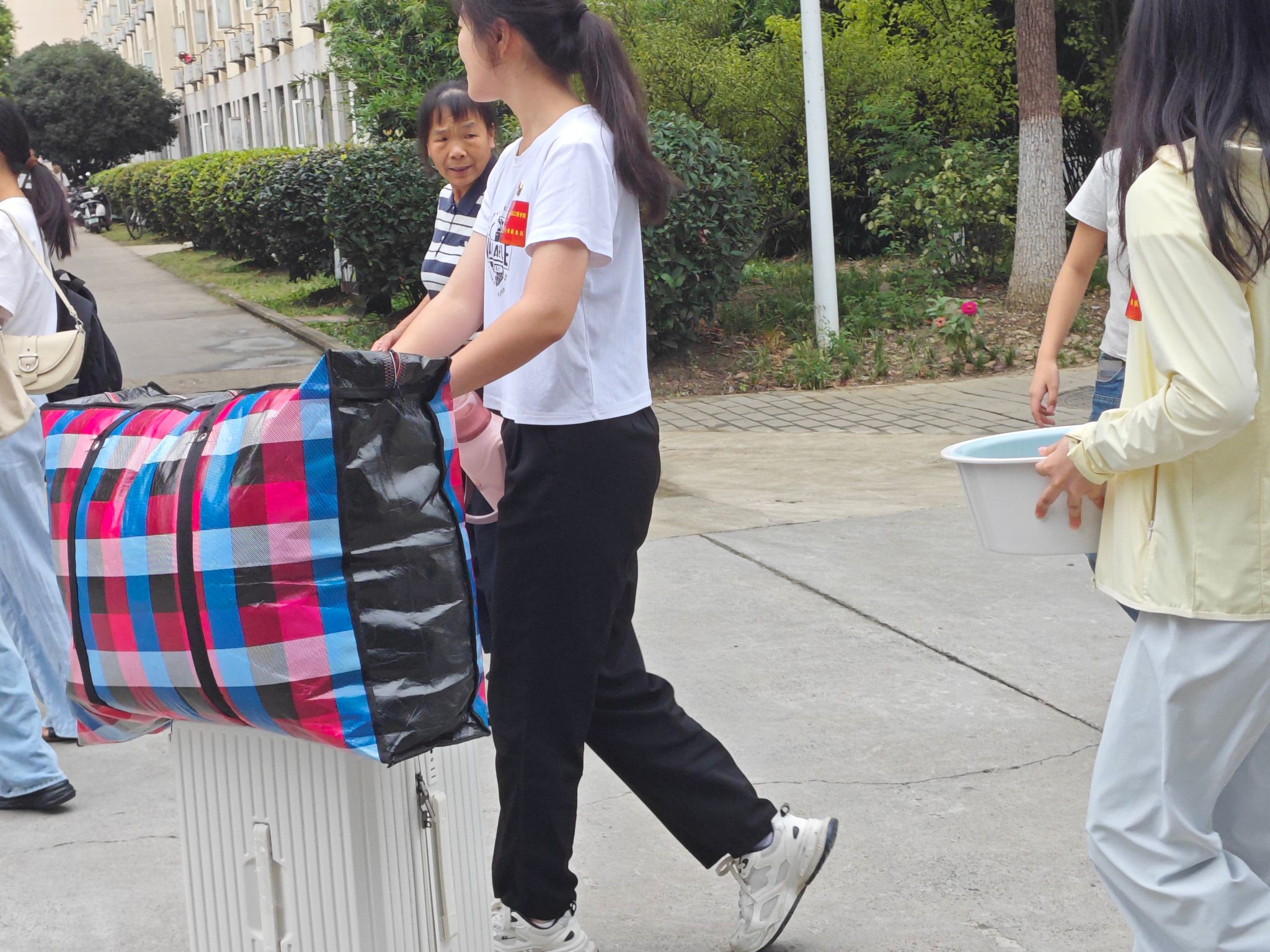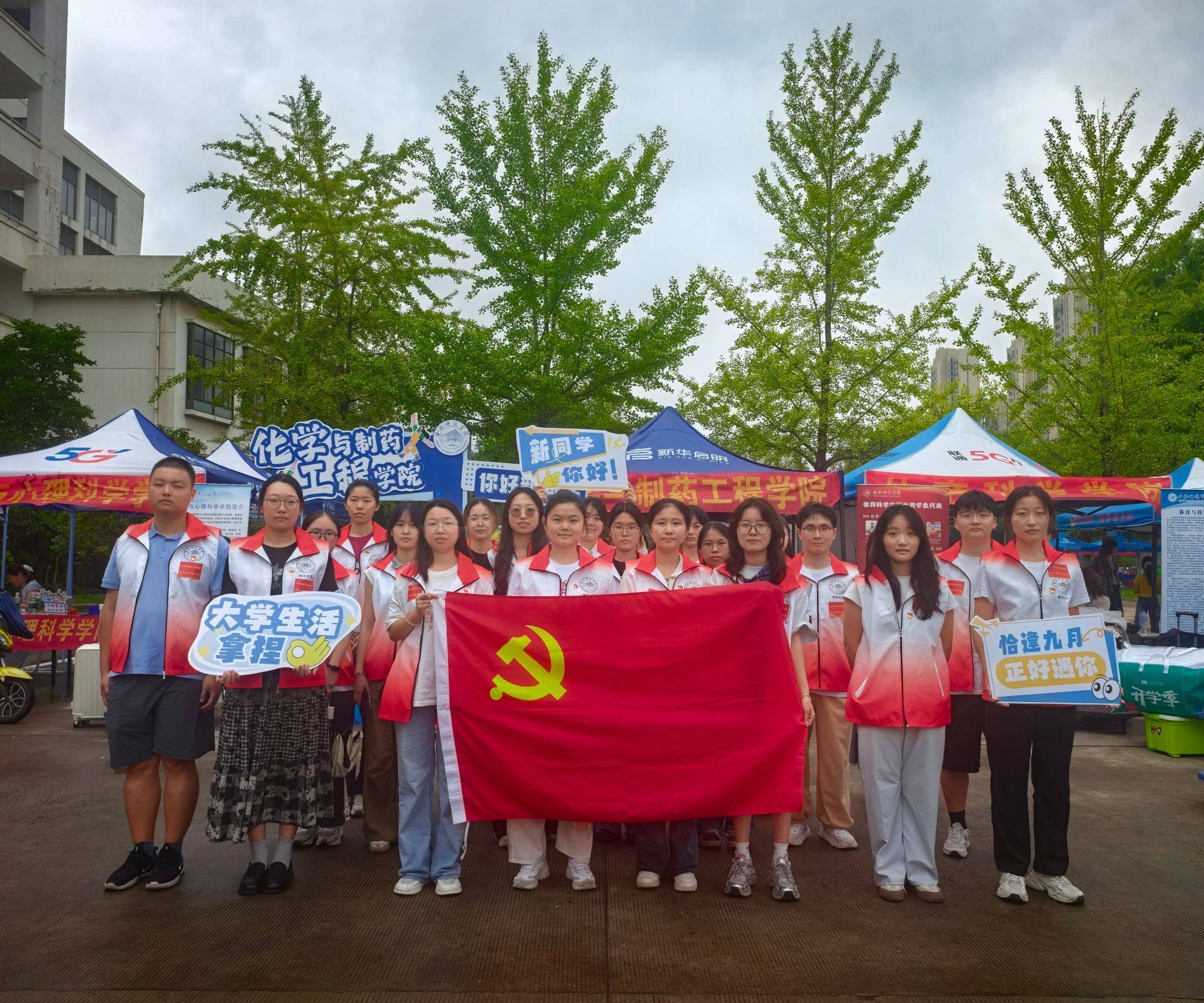 迎新现场,细雨淅沥,党员志愿者们各司其职,忙碌而有序。在东门和北门两个主要入口,志愿者们高举指示牌,耐心地为新生和家长指引路线、解答疑问,帮助他们快速熟悉校园环境。在宿舍楼,志愿者们主动上前,不辞辛劳地帮助新生搬运行李,往返于各栋宿舍楼之间。虽然天气炎热,但志愿者们始终保持着饱满的热情,用真诚的微笑和细致的服务温暖着每一位新生。
