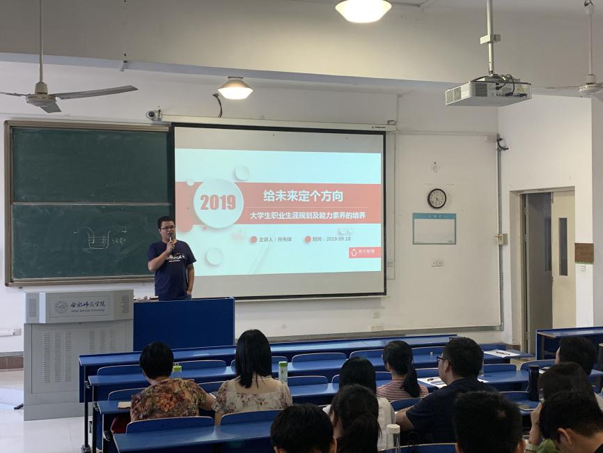 本网讯 9月18日下午,高牛数理培训学校校长孙先锋应邀在我校锦绣校区逸夫楼201教室作了题为“给未来定个方向-大学生职业生涯规划及能力素养的培养”的专题讲座。讲座由化学教育系主任凌波主持,化学教育系部分教师及2017级、2018级全体学生一同聆听了讲座。