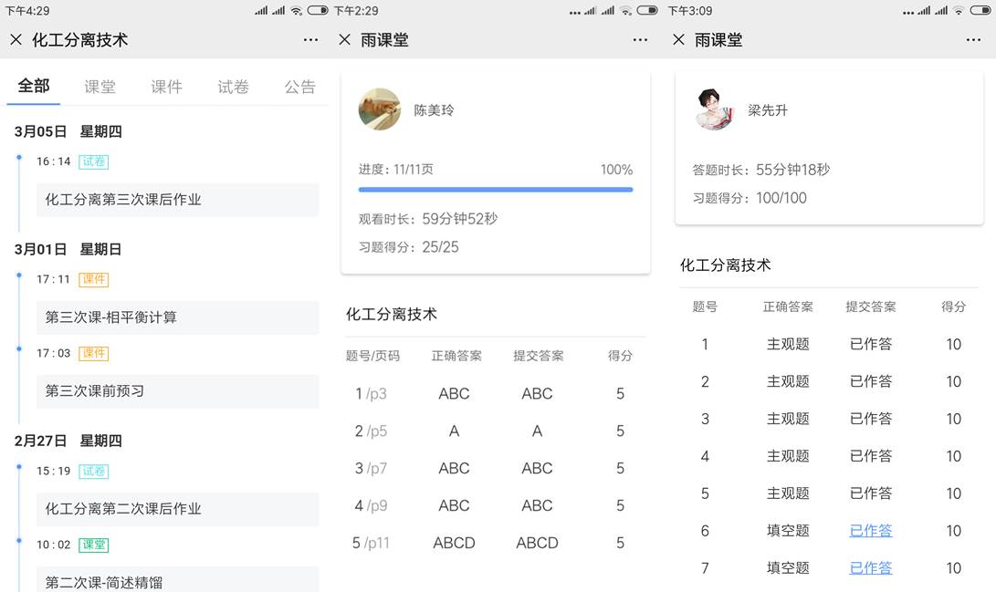 注重在线课堂互动。将ppt内容配以详尽的语音讲解,以方便学生在线学习或课后复习,有助于学生理解新课内容。为避免高峰时期“雨课堂”教学平台的卡顿现象影响课堂教学,还建立了“化工分离-疫情期间”qq群,利用qq群的“分享屏幕”功能进行交流互动与课程讲解,保证远程授课的顺利进行,并且师生之间能够充分互动。针对部分同学可能出现的学习注意力不集中的问题,采用课堂测试题、随机点名与课堂作业的方式督促学生认真学习,提高学生学习注意力,加强学生学习兴趣。