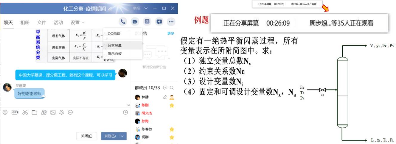 在新冠肺炎疫情防控特殊时期,为确保“延期不延教,停课不停学”,学院教师全面开展线上授课,在屏幕前开启了线上教学之旅。作为一名“老党员+新教师”,线上教学对我来说是一项全新的挑战,为了全面迎接这一挑战,打好线上这一战,我早在寒假期间就积极做好线上教学准备,充分利用雨课堂平台与qq群的功能作用,通过观看示范课以及总结网络教学的特点,结合我承担的《化工分离技术》课程教材的内容对教学过程进行了重新设计,最终使云端课堂得到了有序开展。