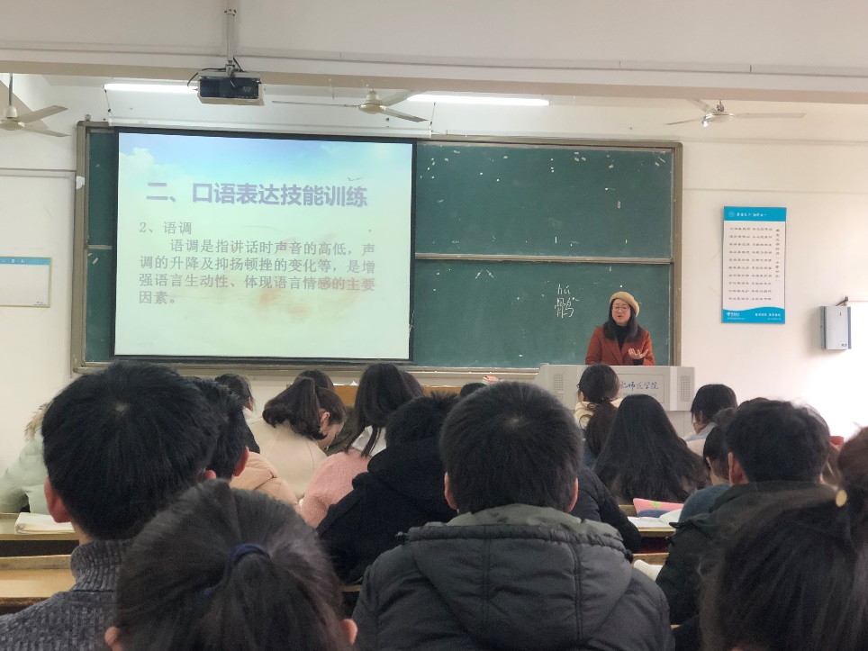 WilliamHill官方网站附属小学语文高级教师郑收老师为2017级化学(师范)班讲授《教师口语与教师礼仪》,郑老师多次参加国家级、省级以上教学比赛并获奖,对教师口语与教师礼仪课程理解深刻,讲授专业,上课生动,课堂气氛热烈,获得了很好的教学效果。