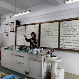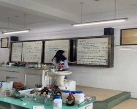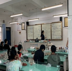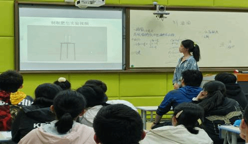 温红娟、王亚超、安芳宁、尹邓雨四位同学对四个班级进行了实验教学,其余四位同学辅助教学,看管学生进行皂化反应与酯化反应的实验,在这个过程中解决学生遇到的问题,帮助学生补充添加药品。