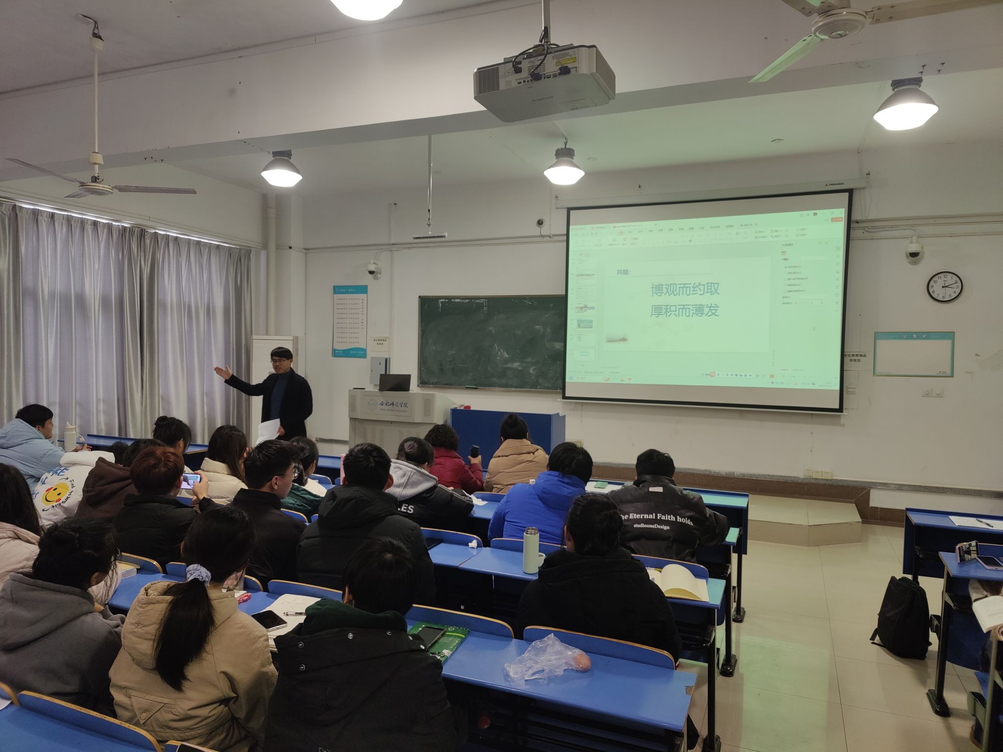 首先我院研究生校外导师,合肥第46中学正高级教师江乐霄老师结合自身多年的实践经验,深入浅出地从面试目标、内容、方法、高分案例分享四个方面给学生们全面呈现了教资与考编面试过程中的要点,介绍了无生上课和说课的特点与注意事项。