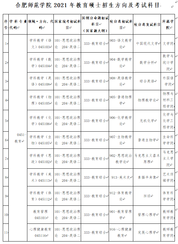 其中思想政治理论、英语二由教育部统一命题;2021级教育综合(参照国家教指委2019年制定2020年发布的新考纲)为国纲自命题(含联合命题、代命题、校自命题);学科教学方向/教育管理方向/心理健康教育方向专业课为我校自命题科目。