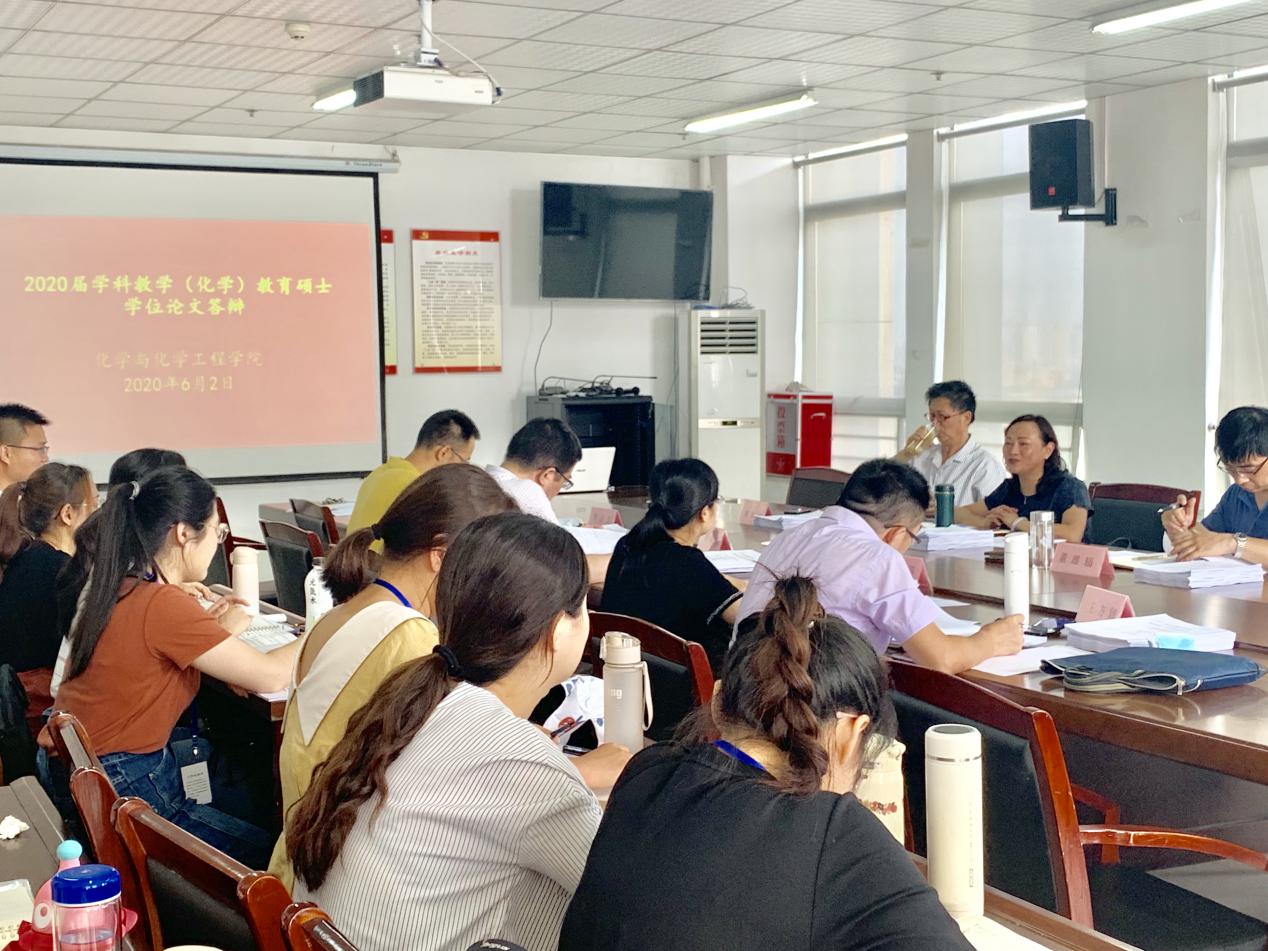本网讯 6月2日上午,2020届学科教学(化学)教育硕士专业学位论文答辩会在化学与化学工程学院1402室举行。院长方东玲出席答辩会。答辩委员会主席由合肥市第六十五中学正高级教师、全国优秀名师工作室主持人、合肥市学科带头人江乐霄担任,答辩委员会成员由姚如富、董雄辎、朱金苗、姚成立、李红英、王方阔6位硕士生导师组成。2019级研究生参加答辩会。