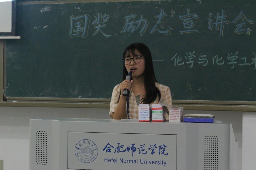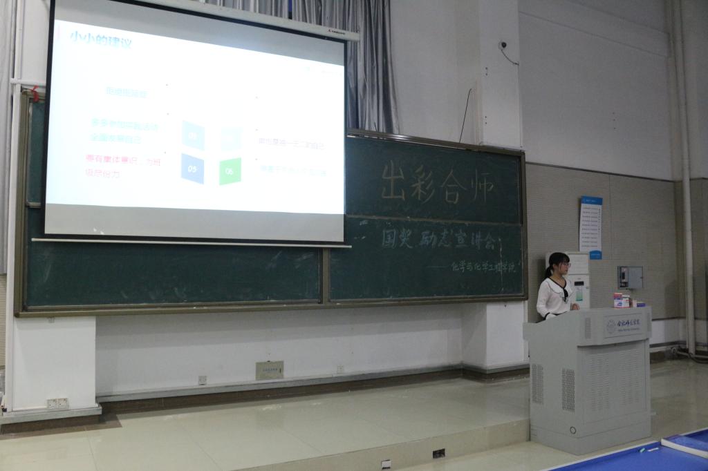 然后由国家励志奖学金获得者2016级化学师范专业史青青同学发言,史青青同学主要与同学分享了英语四六级、考研英语的备考经验,针对分值设置、时间分配、做题顺序、精做真题等方面做出详细解释。同时,也表示要多参加学生会、社团以及志愿者活动,增强实践能力。最后对大一大二学生提出了自己的建议:明确目标,丰富自己,热爱生活。
