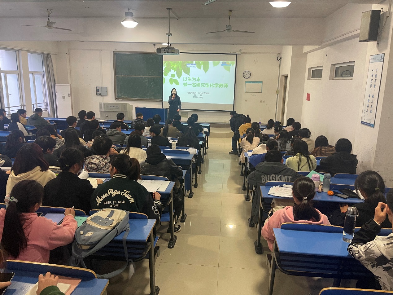 徐蓉以《以生为本,做一名研究型化学教师》为题,从“研究学生”“研究教材”“研究课堂”“研究班级管理”等四个方面展开。讲座用生动的事例阐述了一个优秀的中学班主任应该如何关注青春期学生心理特点,关心关爱学生;用化学的语言给同学们展示了一名优秀化学老师应该如何研究教材、研究课堂。