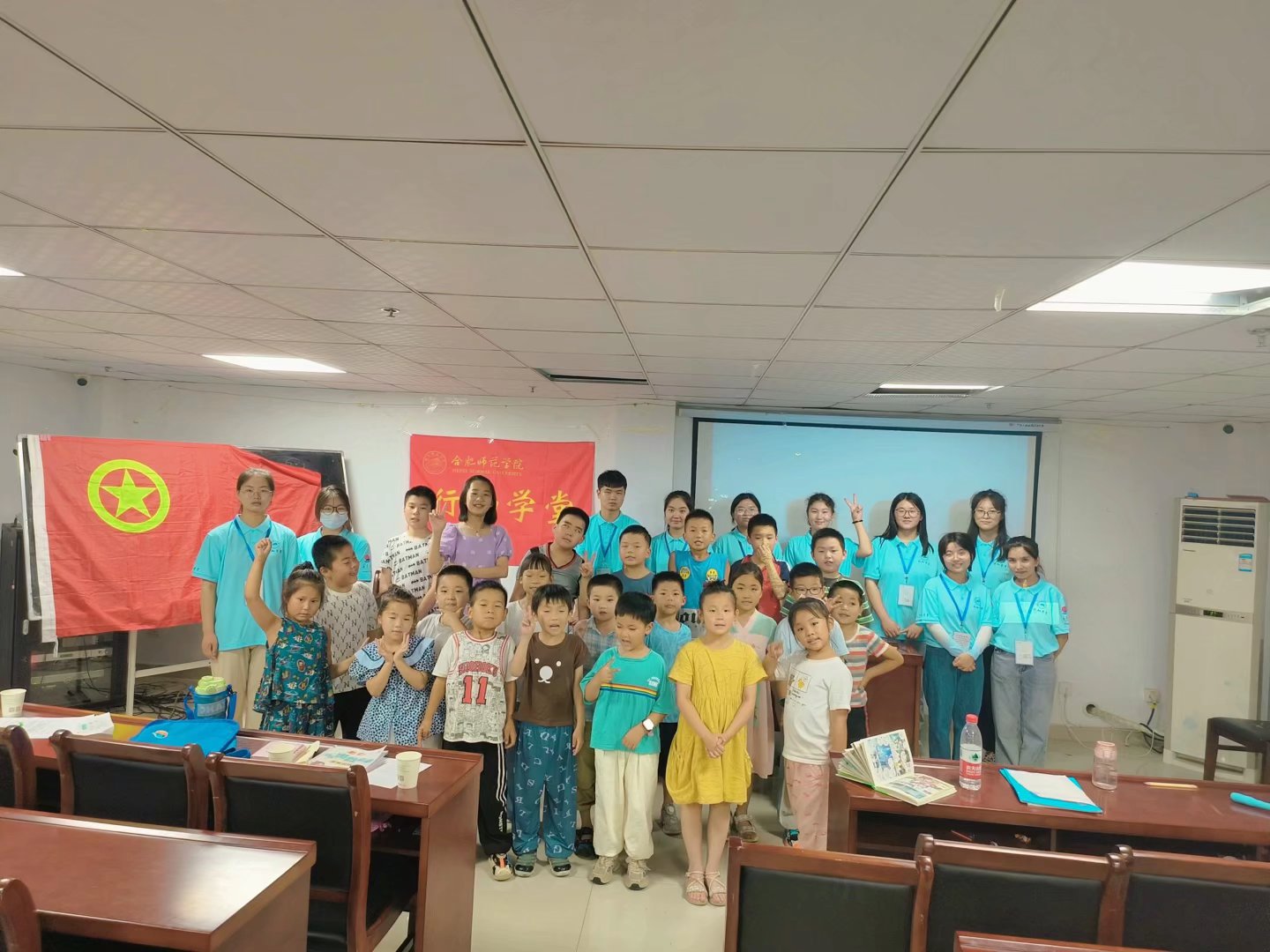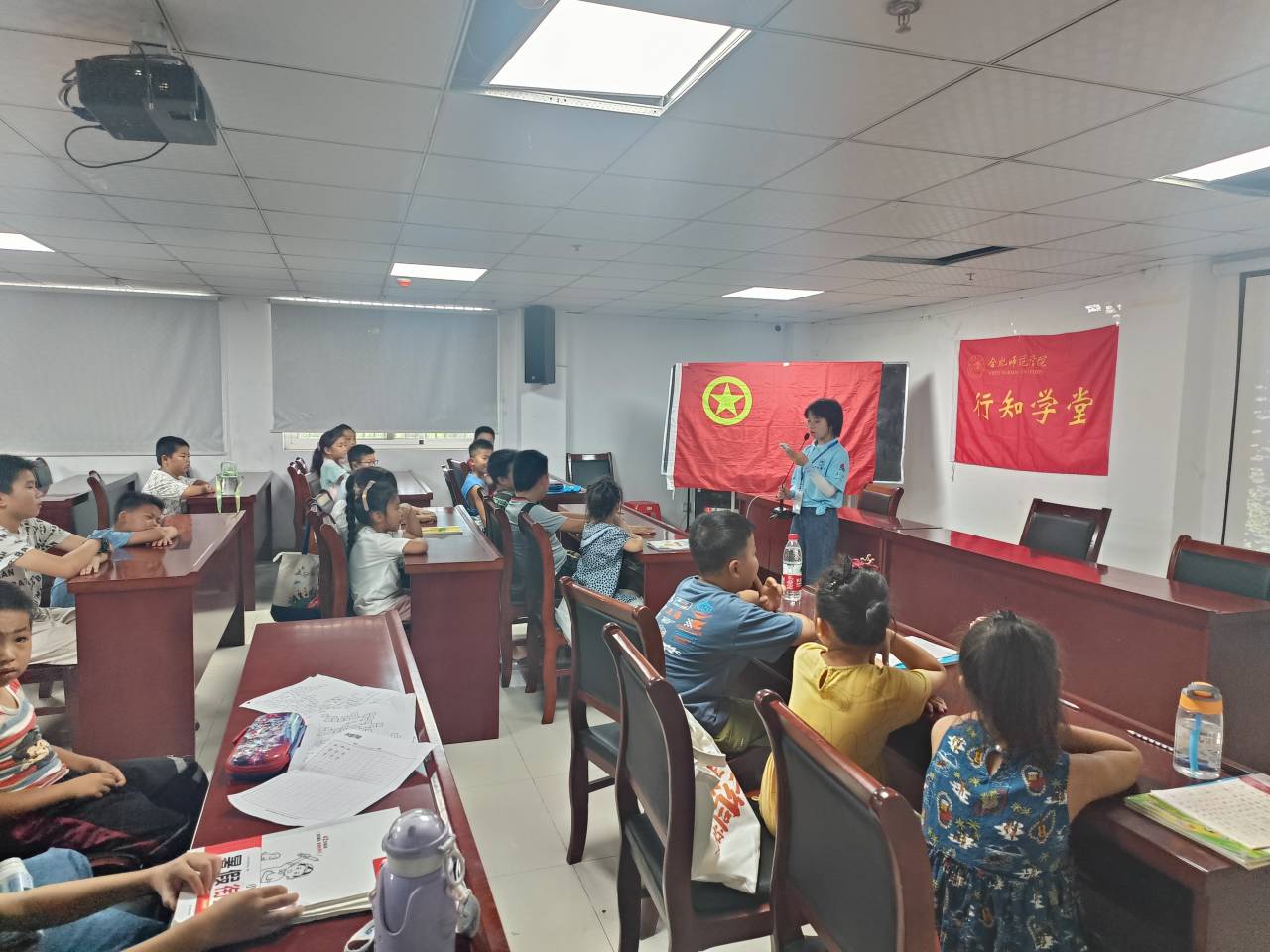 “姐姐,我的团旗画好了!” “姐姐,我的也好了!” “哥哥,你看我的这幅画好看吗?” ……面对小朋友们的热情邀请和分享,小先生们耐心倾听,悉心照料,用爱陪伴左右,用心呵护成长。为传递红色基因,引导孩子们热爱祖国,热爱社会主义,增进小学员们对红色知识文化的了解,小先生们带着小学员们一起学习了《光荣啊!中国共青团》这首歌,“我们是五月的花海,用青春拥抱时代;我们是初升的太阳,用生命点燃未来……”这首歌唱出了慷慨激昂,唱出了荡气回肠。小先生也鼓励小学员们学习英模前辈无私奉献、热爱祖国的精神品质,学习文化知识,成为对国家和社会有用的栋梁。之后小先生带着小学员们学习了一些建团的相关知识:学习了团史,认识了团徽,也亲手动手画了团旗。孩子们都很热情,也很积极主动,最终每个人都成功地画出了自己满意的团旗,小先生们也拍下了这值得记录的一刻。