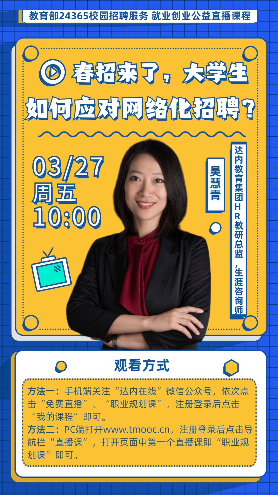 教育部24365校园招聘服务 就业创业公益直播课程(第二期)第一课,3月27日(周五)10:00开讲,敬请关注!