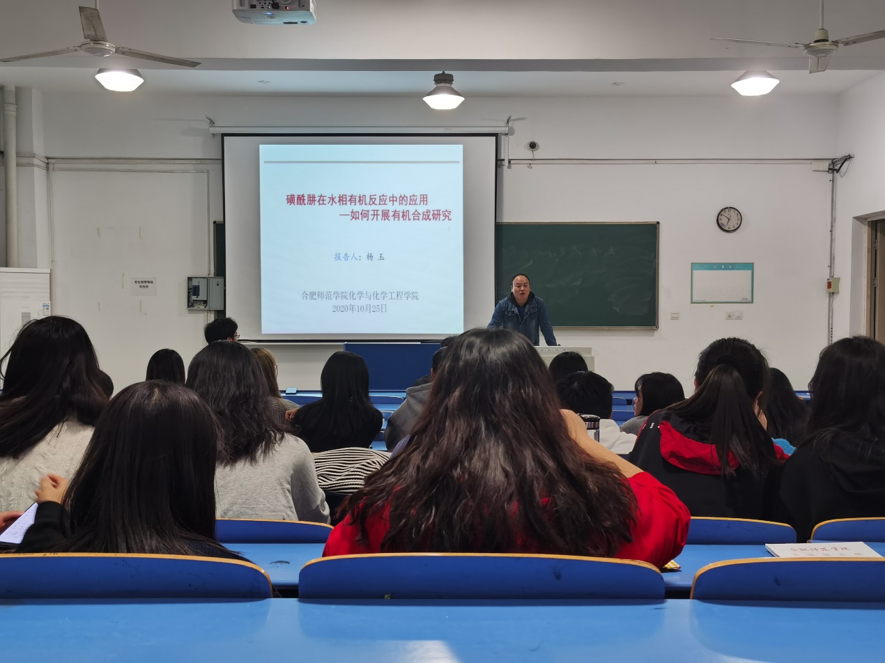 杨老师主要从事主绿色合成研究,此次针对磺酰肼分子在水相有机合成领域的研究进行了介绍。由于这类分子独特的分子结构和较多的反应位点,可以在水相中表现出不同的反应活性,并且通过对其进行不同温度的控制,可以得到不同反应类型的有机合成产物。另外,通过合成方法学的系统介绍,让同学们了解如何开展一项有机合成反应,为同学们考研和今后的学习研究提供了一定的指导作用。