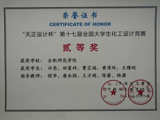 本网讯 近日,由中国化工学会和中国化工教育协会主办的第十七届全国大学生化工设计竞赛落下帷幕,学院学子喜获佳绩。“腈进不休”团队(成员:许亮、田富祥、曹芷瑞、黄清玲、王豫皖,指导老师:程华、唐永强、王方阔、陈蕾、杨潇)荣获华中赛区一等奖,全国二等奖;“霹雳无敌队”(成员:朱雨、王帅鹏、李金秋、马欣月、袁荣,指导老师:李亮、袁新松、毕文杰)荣获华中赛区三等奖。