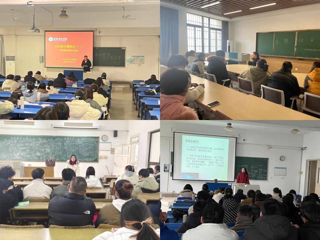根据不同年级,辅导员、班主任们分别开展了有针对性的主题教育。2022级年级辅导员向同学们强调要加强自我管理,积极参加学术科技、志愿服务等方面的活动,切实提高自身综合素质。2021级年级辅导员、班主任强调认真备考期末考试、四六级考试,培养良好的作息习惯,注意个人卫生,好好锻炼身体;2020级辅导员、班主任根据专业的不同,做了细致的专业考研介绍和动员工作,另从考公、就业、考编、入伍、选调生等方面向同学们介绍了未来毕业的方向,引导学生找准目标,提前规划,制定计划;2019级年级辅导员对毕业班学生加强了安全教育、强调了就业工作、毕业班综测和评奖评优等工作。(化学与化学工程学院:汪颖 汤晴川)