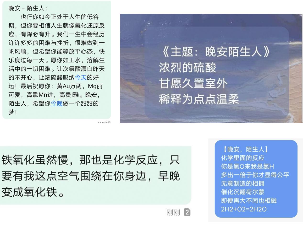 晚安陌生人活动契合了化院特色,使用化学相关知识来撰写增添了乐趣和可读性,也促使更多人了解化学并且感受到了化学的独特魅力。同时拉进了同学们的心灵距离,在倾诉自身的同时也接收到来自陌生人的一份温暖,营造出融洽的校园氛围。(化学与化学工程学院:李振、原嘉清)
