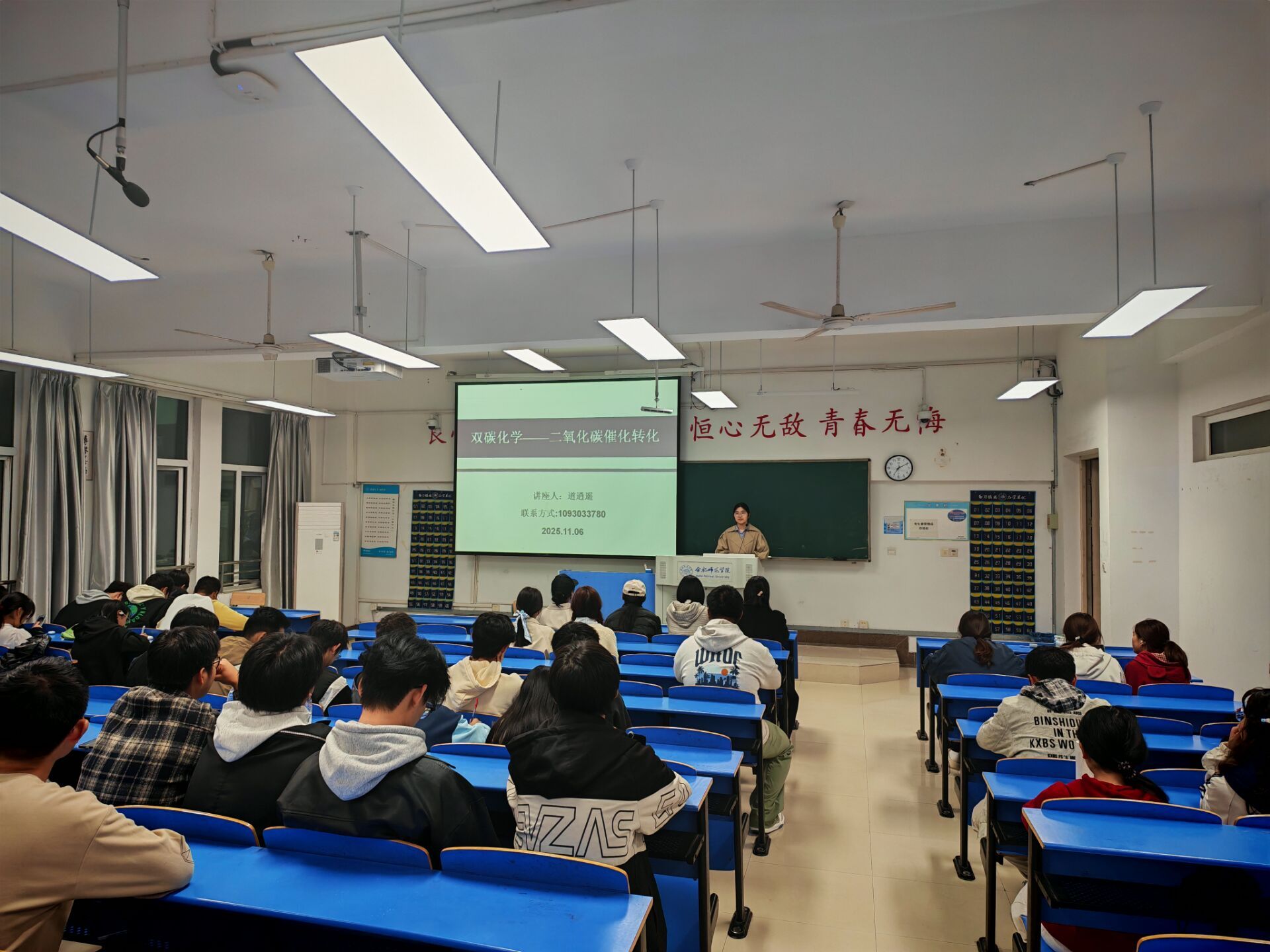 本网讯 11月6日下午,williamhill英国官网教师道逍遥博士在锦绣校区逸夫楼A306举行了一场题为“双碳化学——二氧化碳催化转化”的学术报告。化学等相关专业学生聆听了报告。