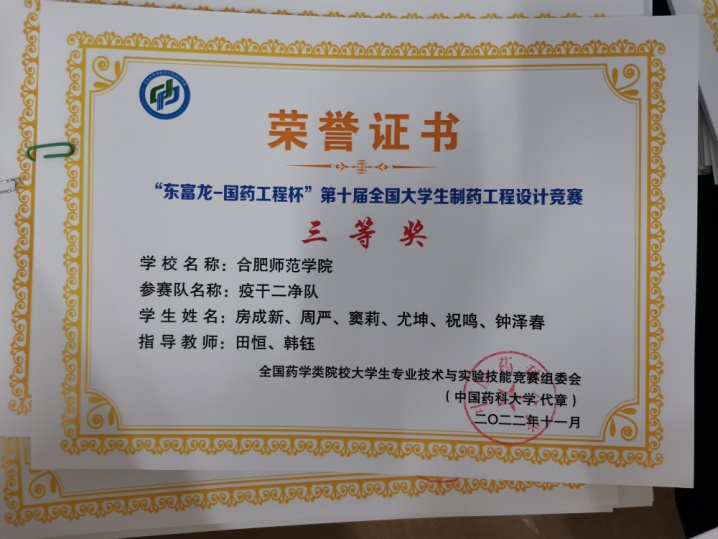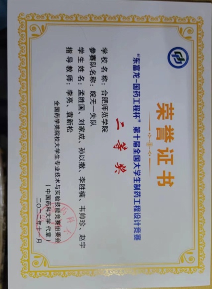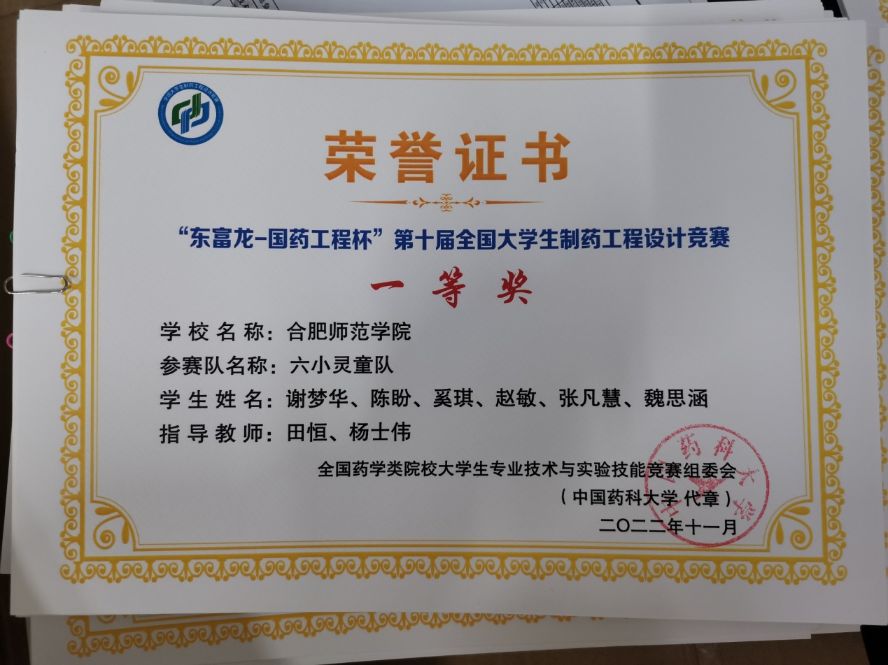 本网讯 由全国药学类院校大学生专业技术与实验技能竞赛组委会主办,上海东富龙科技股份有限公司与中国医药集团联合工程有限公司协办,湖北工业大学承办的第十届“国药工程-东富龙杯”全国大学生制药工程设计竞赛总决赛落下帷幕。我校化学与化学工程学院选派的三支队伍分别获得全国一、二和三等奖。其中,田恒、杨士伟两位老师指导的,由谢梦华、陈盼、奚琪、赵敏、张凡慧、魏思涵等组成的“六小灵童”队获得全国一等奖,这是继2018年后我校在该赛事上的再次获得最高奖项。
